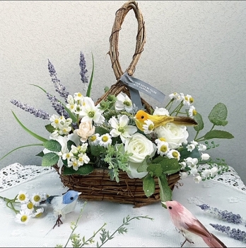 風薫る季節。バラをメインに美しい花々が咲きほこるトヨコハウスの庭に癒やされてみませんか。初夏のナチュラルガーデンをイメージしたさわやかな色合いでバラ、ラベンダー、スズランなど可愛い小花に、小鳥をとまらせて癒やしのアレンジメントを作りましょう。カゴは置いても掛けても飾ることができ、また母の日やお祝いのプレゼントとしても喜ばれます(ラッピングも可能)。 庭に咲くバラのプレゼント(開花状況による)もあります。ガーデニングのお話を聞きながらシフォンケーキと紅茶でほっこり。アットホームな雰囲気も好評で、毎回キャンセル待ちが出るほどの人気講座です。