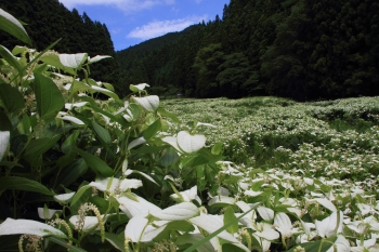 半夏生は72侯のひとつである「半夏生(はんげしょう)」の頃に花を咲かせることから名づけられたという植物です。御杖村の岡田の谷ではこの半夏生が3000㎡に渡って群生しています。
