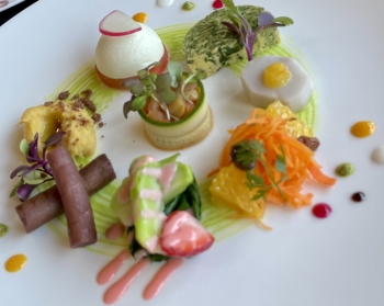 旬のお野菜で奏でる前菜8種類、旬野菜のポタージュ、お魚料理、お肉料理、デザート、パン、コーヒーまたはフレーバーティー