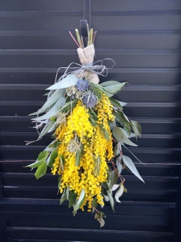 黄色くてふわふわのかわいい春を告げる人気のお花「ミモザ」。生花のミモザにエリンジュームやユーカリなどをあしらいリースに。このままドライフラワーになり長くお楽しみいただけます。少人数の丁寧なレッスンです。スワッグ希望は事前に連絡ください。
