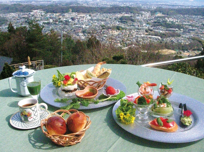 生駒山中腹にある同店は、生駒や奈良市内を一望でき、遠くには比叡山も望める、まさに天空のレストラン。化学調味料を一切使わず、有機野菜や自家製パンなど体に優しい素材を使った創作料理を提供。和洋中折衷でメニューはお任せとなります。このプランは特別にケーキ付き。食事の後は場所を変えて一番眺めの良いティーラウンジでゆっくりとお楽しみください。毎年好評の同プランが、今年は春からスタートです。季節ごとに咲く花もお楽しみください。