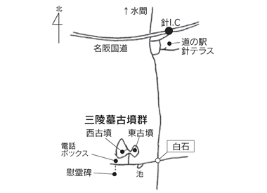 針インターから南へ約2km、西に数百メートル進むと三陵墓古墳群のある史跡公園の案内看板がある。その通りに坂道を下ると目の前に大きな古墳が見えてくる。その東古墳は5世紀半ばの前方後円墳。規模も全長110mという大和高原最大の大きさだ。都祁直(つげのあたい)か闘鶏国造(つげのくにのみやつこ)の墓と推定されるが定かではない。前方にある階段を登っていくと奥の円部の本体が見えてくる。円部には、かつてこのような円形の埴輪があったであろう装飾が施されており前方後円墳の形がはっきりしていた。
