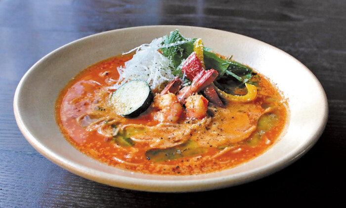 麺は小西勇製麺(桜井市)の全粒粉そうめん。少し太めで香ばしい風味ともちもちとした食感が特徴。鯛だしをベースにトマトとエビのうま味を凝縮したスープとの相性も良く、人気のメニュー。マリネ風の夏野菜で彩りを添える。