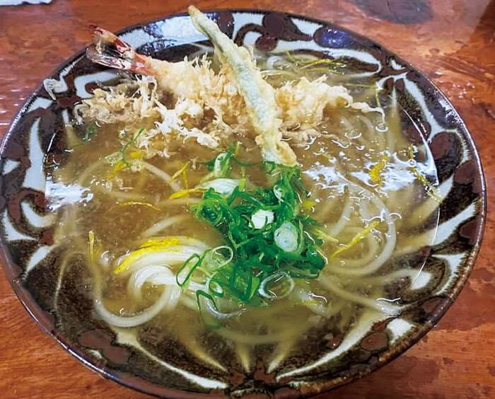 だしの深みを味わってもらおうと、0.01mmの薄さに削ったかつお節「追い鰹(かつお)」も用意しています。 天ぷらうどんや大判きつねうどんなどのうどんメニューのほか、総菜などとも一緒になった御膳ものも用意。冬の定番「えび天鍋焼きうどん」は身体温まる一品です。