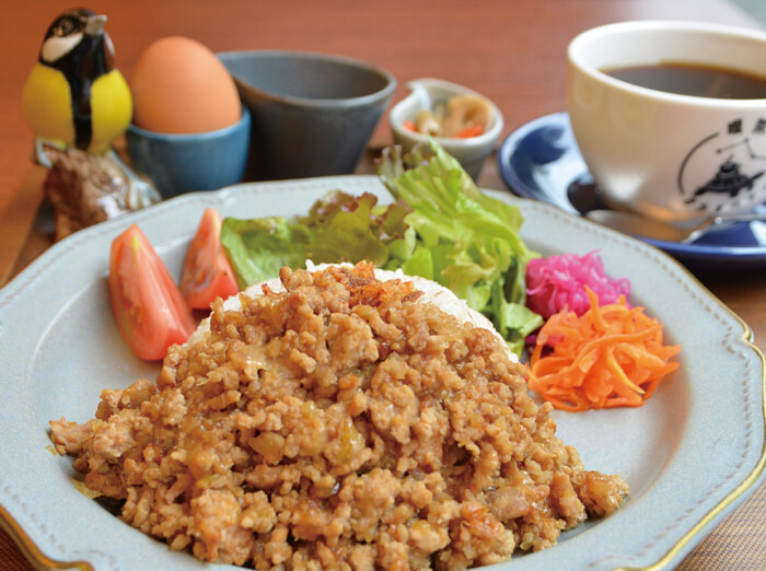 豚のひき肉をいため、一度脂を捨ててから玉ねぎと一緒に甘辛くいためたそぼろは脂っぽさも抑えられ女性にも人気のメニュー。押し麦ご飯に、サラダと温泉卵がつく。ドリンクは別途料金で、セットで頼むと200円引きに。