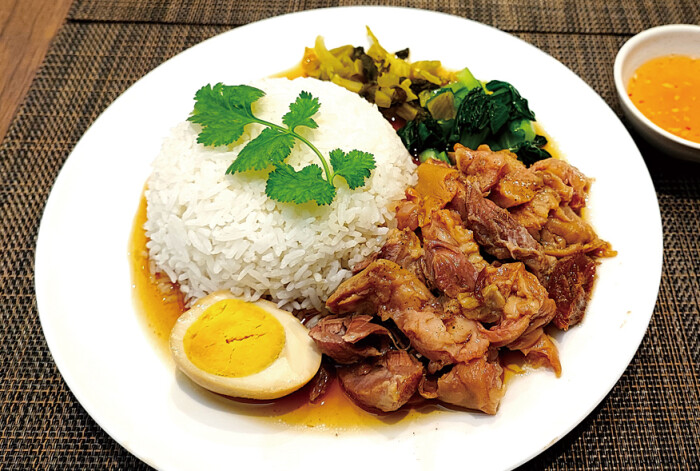 タイの屋台では身近なメニュー。豚足とすね肉を甘辛いしょう油ベースのたれで煮込み、ジャスミンライスに合わせて食べる。煮卵や青菜が添えられ、コク深い味わいが特徴。