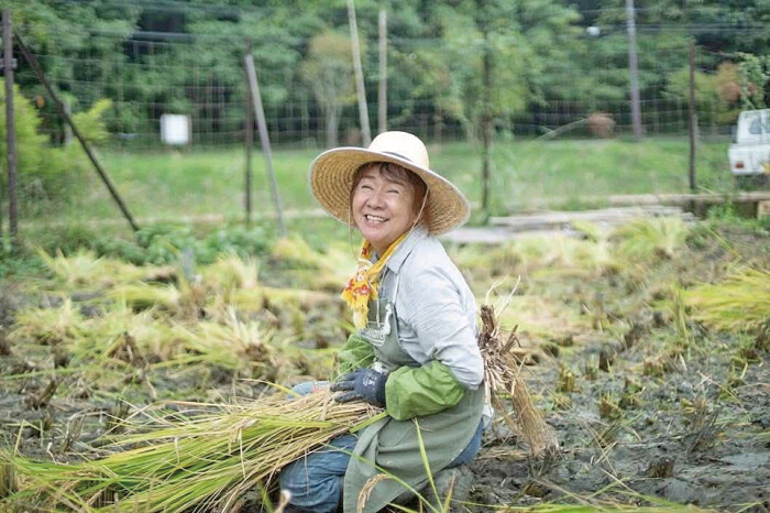 農薬も肥料も一切使用しないで米作りをしているまぁまぁ農園の上田かおりさん(66)。米作りの様子を見学したり、関わりをもってくれた人に米を販売。「米作りに関心を持つことで、食への興味を深め、暮らすとは何かについても考えてほしい」とのこと。「うちの田んぼはとっても美しいよ」と話す顔が輝く。