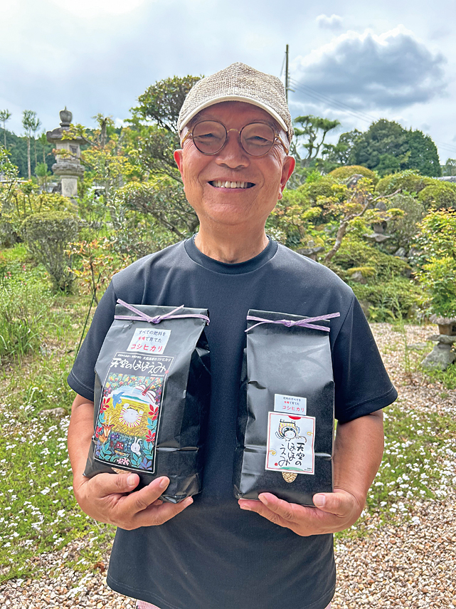 奈良市都祁吐山町で、有機と乳酸菌を活用してコシヒカリを育てる。第15回お米日本一コンテストinしずおかで最高金賞の受賞経験のある米は、リピーターも多い。土づくりは、稲刈り後すぐにスタート。わらやもみがら燻炭(くんたん)などの有機物を土に混ぜ、土の中にいる微生物を活発にすることで、土に活力をもたらす。
