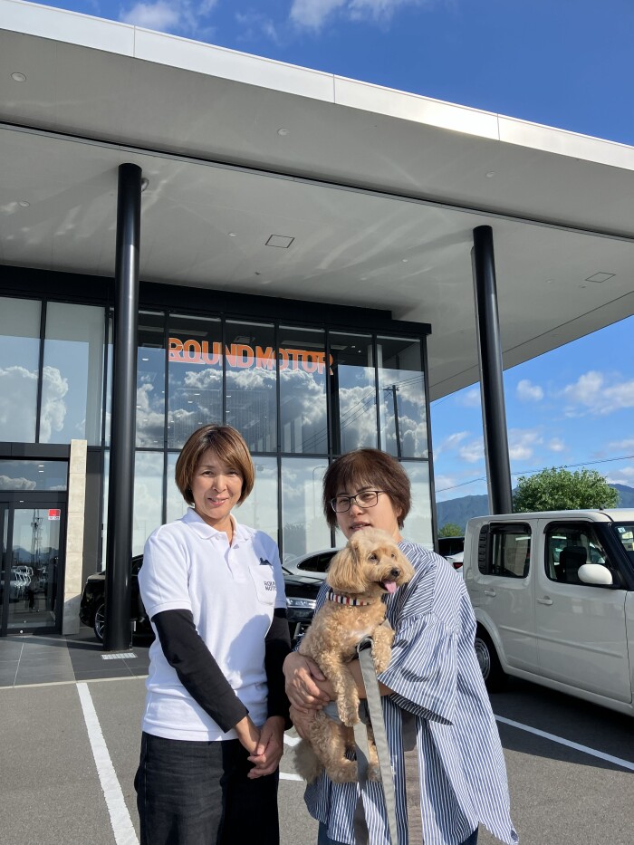 ボランティア団体「ペット防災withwan(ウィズワン)」代表の安岡祐子さん・愛犬のそらさん(写真右)とラウンドモーター取締役の西井貴保さん