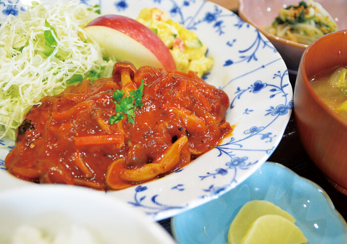 店主はフランス料理のシェフを経て大阪でレストランを経営。故郷で同店を開きました。看板メニューのハンバーグは国産牛の牛肉100%でふっくらとジューシー。野菜は自家栽培メインで付け合わせや具材にし、旬味を表現しています。ランチセット1080円をはじめセットメニューも豊富。