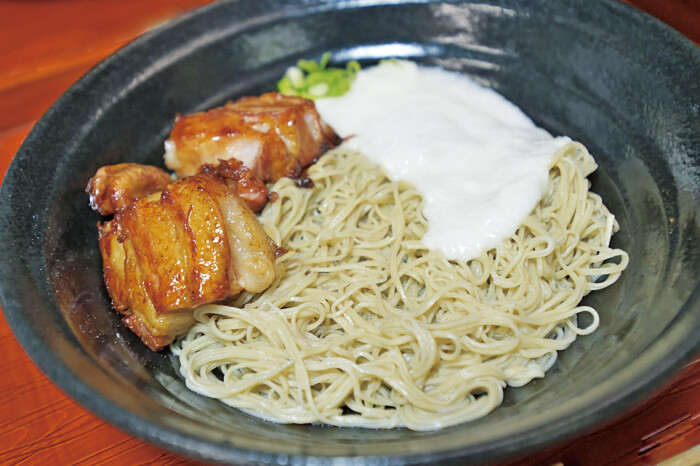 そばは独学で打ち方を覚え、今は極細の十割そばを提供。オープン時から出している豚の角煮は「脂身がおいしい」というヤマトポークを使い、基本的な調味料で数時間かけて煮込んでいます。注文が入ってから、もうひと手間掛けているのが特徴だそう。その両方を味わえる角煮とろろ蕎麦1880円が人気とのことです。