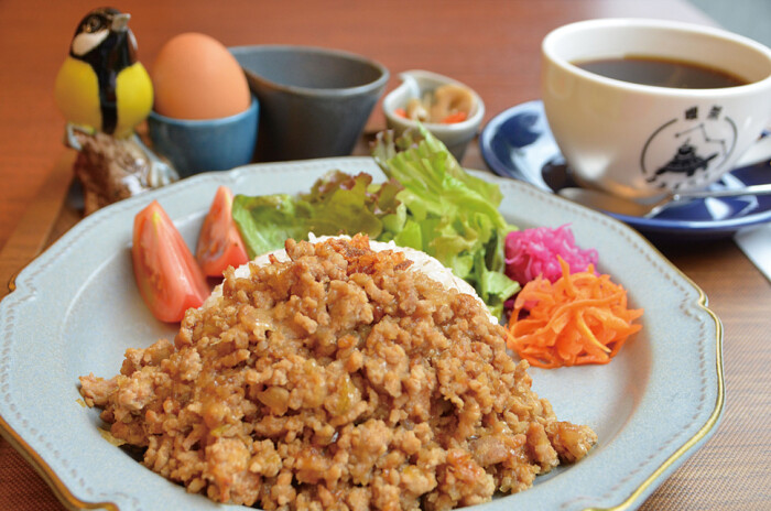 オーナーの祖父が営んでいたレース工場の跡地を活用した隠れ家カフェ。親類の工場から譲り受けた扉やカウンターはイギリスのアンティーク家具を思わせ、レトロな雰囲気を演出してくれています。自然の景色を眺めながら味わえるランチは、イギリスの郷土料理をベースにしたコテージパイ1580円やひよこ豆のカレー980円など。