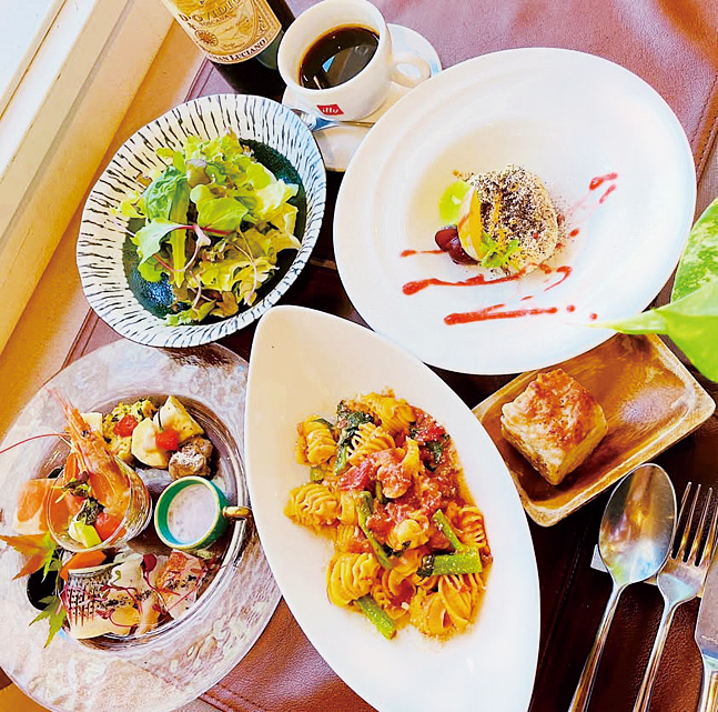 野菜は加茂町の契約農家から、魚類は全国の漁港から新鮮な素材を入手し、皿いっぱいに盛り付けた前菜は、見た目にも鮮やかです。パスタランチ2750円では、麺は乾麺または生麺を選べます。そのほか、ボリュームあるピザを味わえるピッツァランチ2970円や、パスタランチにメイン料理を追加したビステールランチ3630円も用意しています。