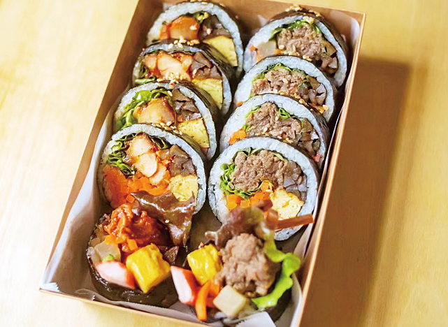奈良オモテナシ食堂の姉妹店となるキンパ専門店で、ソウル・琴湖洞“金家の味”を受け継いでいます。キンパとは、ごま油で味付けしたご飯と具材をのりで巻いた韓国風ののり巻きこと。同店のキンパは、香り高い韓国産海苔と手作りの具材を包み、ひとつひとつ心を込めて手巻きしています。