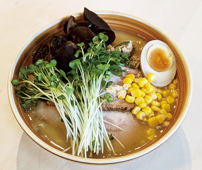 奈良で食べられるのはこの店だけという、北海道・西山製麺の中太ちぢれ麺を使用。味噌のスープがしっかりと麺に絡む。チャーシューや煮卵のほか、コーンやきくらげ、カイワレ大根などラーメンには珍しいトッピングが味わえる。