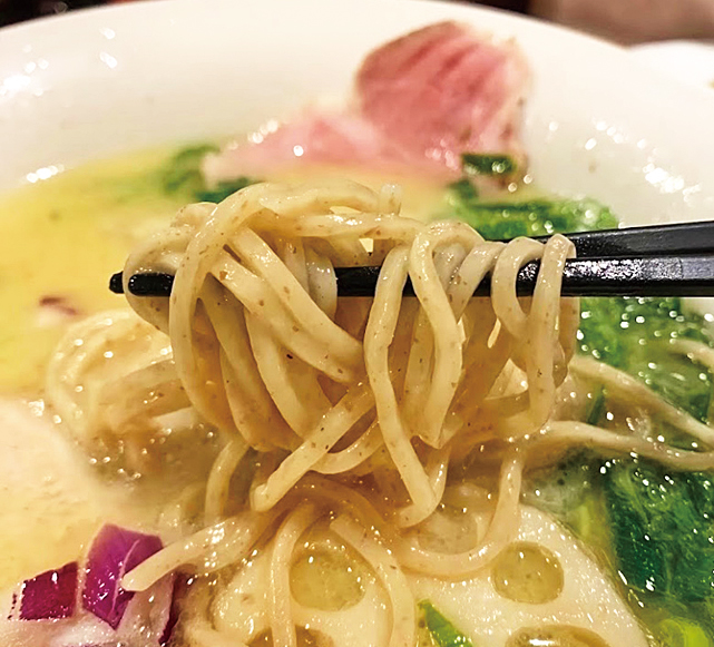独自調合の塩だれにあっさりめの豚骨だし、豚骨と豚トロを炊き出した濃厚スープ、生クリームを配合。クリーミーなのにさらりと飲める。特製ウイング麺にスープが絡み、モチモチ、ツルツルとした独特の食感を楽しめる。