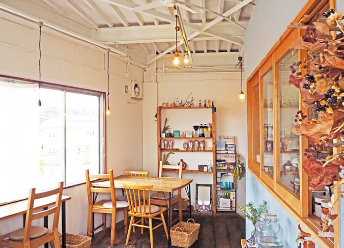 自然の温もりを感じる癒やしのベジタブルカフェ。野菜ソムリエプロの資格をもつオーナーが作る、地元産の旬野菜をメインにしたランチが好評です。味噌やソースなど調味料の一部も手作りし、心と体に優しい料理を提供。また手作りの焼き菓子などスイーツ系もあり、スペシャルティコーヒーも種類豊富です。席に着くと提供される野草茶も嬉しい一杯。自然に生えている植物の葉や茎を収穫し、乾燥、焙煎したオリジナル茶です。また窓辺にはたくさんの多肉植物の寄せ植えが。趣味歴30年というオーナーが育てたもので、中には販売しているものもあります。