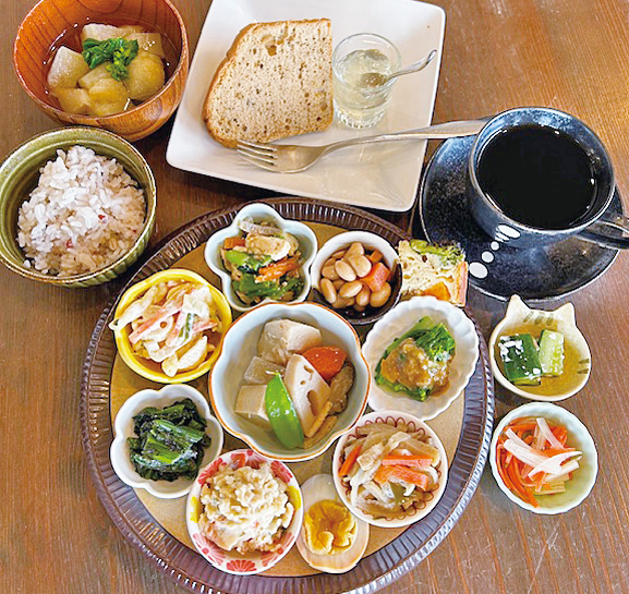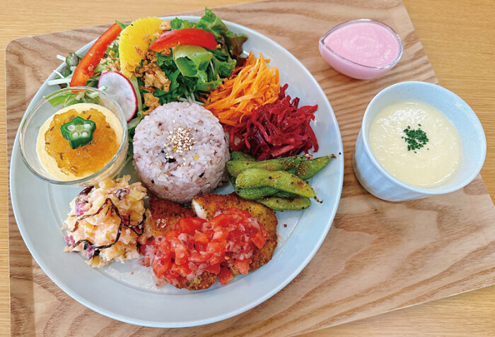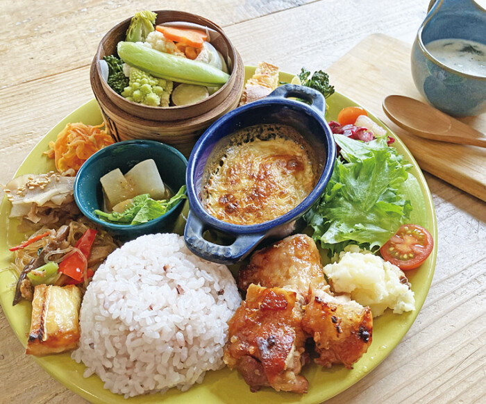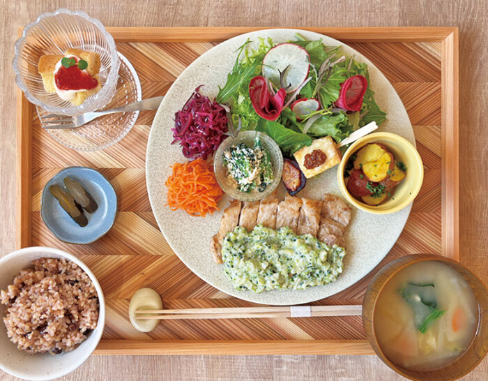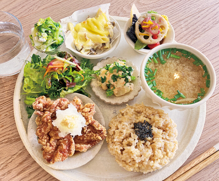 できる限り県産の新鮮野菜を使い、6~7種類の副菜にメイン料理がつく。塩麹やしょう油麹などの調味料も手作り。酵素玄米ご飯を食べられる店として、美容や健康に興味のある人のリピートが多い。