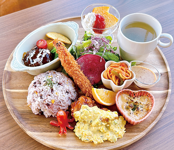 皆が大好きなベスト料理がワンプレートに。ハンバーグや有頭エビフライ、グラタンやチキン南蛮、タコさんウィンナーなどにご飯、汁物、サラダが付いて彩りも満点。ひとくちデザートも付く。事前予約(電話)がベター。