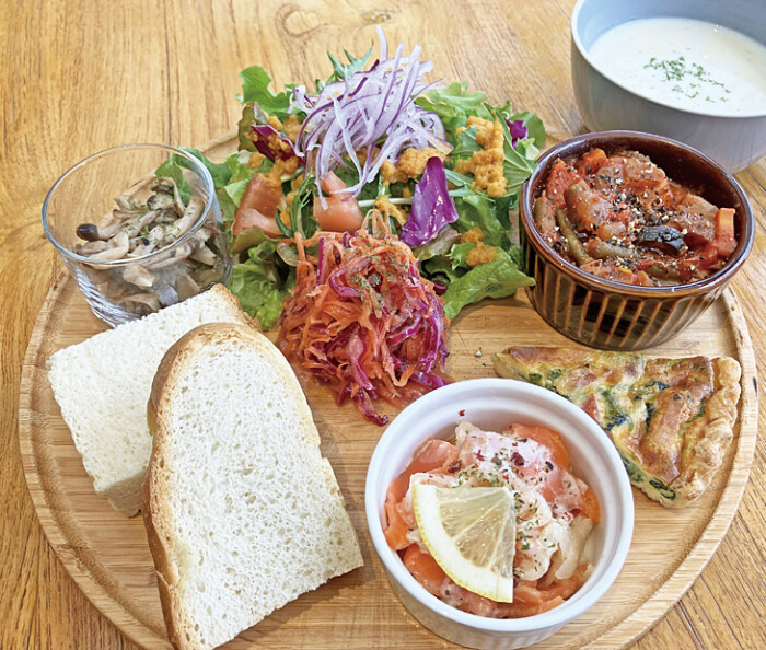 ラぺやキッシュ、キノコソテーやポークのトマト煮、サーモンマリネといった同店人気の料理が季節替わりで5種類。自家製のフォカッチャやサラダがワンプレートに。ポタージュもその時々で変わります。