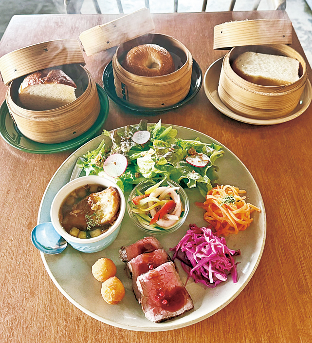 プレートにはサラダやキャロットラペ、今は低温調理したローストビーフなど女性好みの料理が並ぶ。毎朝焼くパンはフォカッチャ、ベーグル、食パンの3種類から選べ、せいろ蒸しで提供。手作りで余計なものは入れず、そのままの味を楽しめる。