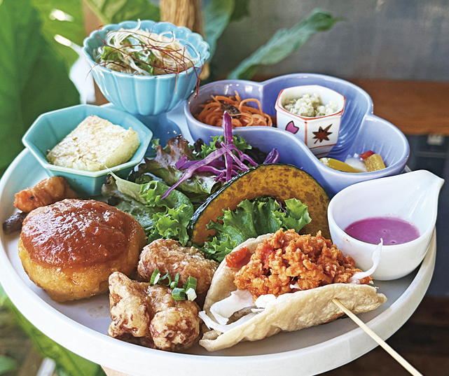 タコスやハンバーグ、から揚げにピクルス、大根餅、ラぺ、季節野菜の総菜など同店の食事メニューがワンプレートに。すべてヴィーガンやグルテンフリーに対応。営業時間内いつでも食べられ、テイクアウトも可能。